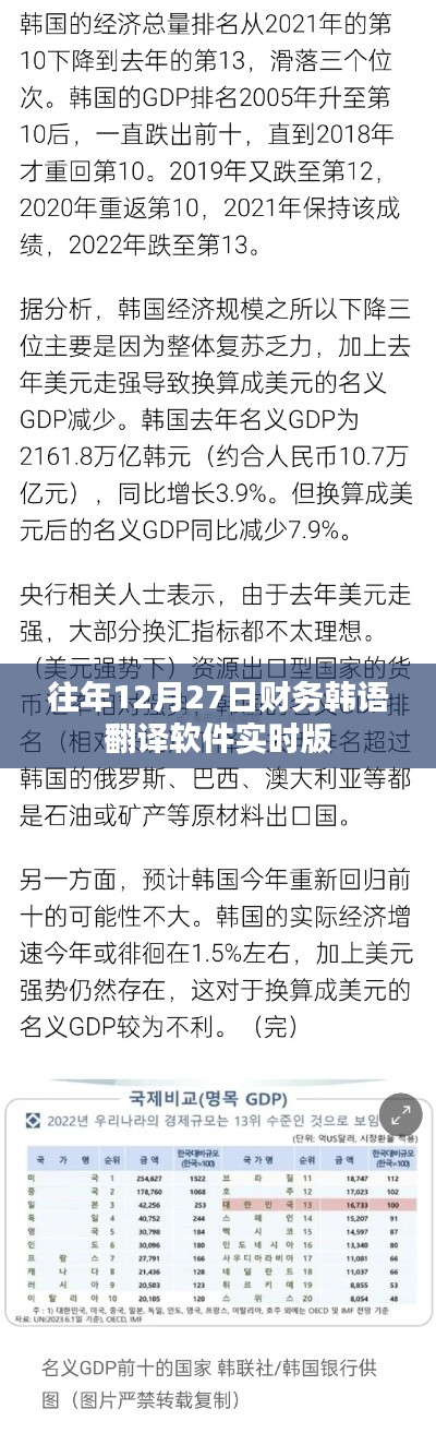 随着全球化的发展,财务领域的跨国交流日益频繁,韩语作为东北亚地区的重要语言,其财务专业术语的翻译需求日益增长,针对此需求,我们推出了一款针对财务领域的韩语翻译软件——往年12月27日财务韩语翻译软件实时版,该软件旨在帮助用户高效、准确地完成财务韩语的翻译工作,提高交流效率,降低成本。