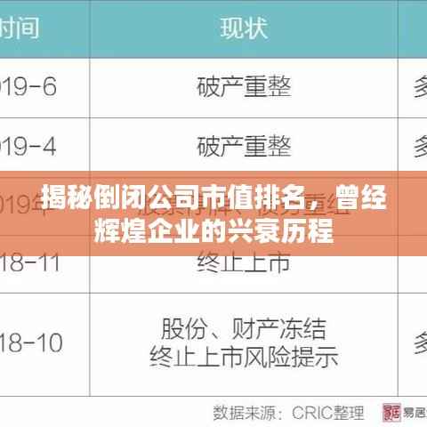 在商业世界中,企业的发展如同波澜壮阔的大海,有时风平浪静,有时巨浪滔天,有些公司因为各种原因,最终走向了倒闭的边缘,本文将根据“倒闭公司市值排名”这一主题,探讨一些曾经辉煌但最终未能逃脱倒闭命运的企业,以期从中汲取经验和教训。